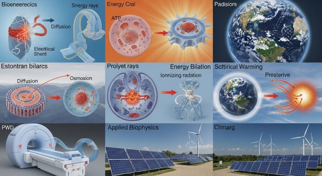 Integra princípios da física para entender processos biológicos e fenômenos naturais. A Biofísica investiga desde moléculas até sistemas vivos complexos. Já os estudos sobre energias e clima abordam fontes renováveis, eficiência energética e mudanças climáticas. Essa subárea é vital para enfrentar os desafios ambientais e energéticos do século XXI.