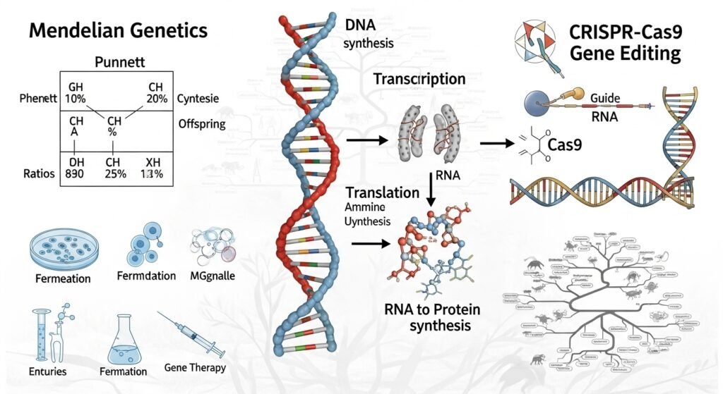 O conhecimento genético é o manual de instruções da Biotecnologia. A compreensão da replicação, transcrição e tradução (Genética) permite o desenvolvimento de ferramentas como o CRISPR-Cas9 (Biotecnologia) para edição genômica precisa. A Genética explica *o que* está sendo modificado, enquanto a Biotecnologia é *como* a modificação é feita.