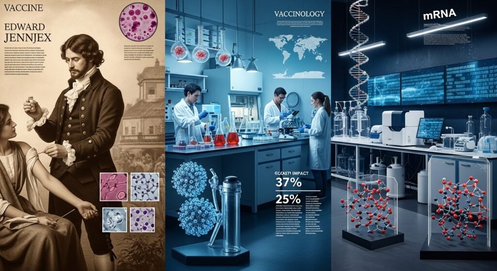 Bem-vindo à exploração interativa da Vacinologia! Esta seção introdutória contextualiza a ciência por trás das vacinas. A vacinologiaCiência multidisciplinar dedicada ao estudo e desenvolvimento de vacinas para prevenir doenças infecciosas e, mais recentemente, tratar outras condições como o câncer. é a ciência que estuda o desenvolvimento de vacinas, ferramentas biotecnológicas cruciais que revolucionaram a saúde pública global. Desde a era pioneira de Edward Jenner, que introduziu a vacina contra a varíola no século XVIII, o campo evoluiu drasticamente: das primeiras preparações usando patógenos atenuados ou inativados para as sofisticadas plataformas moleculares e genéticas de hoje.