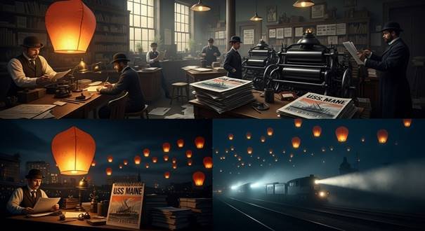 Lanternas chinesas (balões de papel acesos) e refletores de trens a vapor criavam ilusões ópticas, amplificadas por uma imprensa sensacionalista sem freios éticos, à la yellow journalism de William Randolph Hearst.
