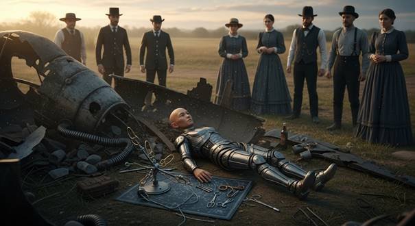 - O “Choque” (6:00h da Manhã, 17 de abril): O airship, a 300 metros de altitude, perdeu sustentação após uma “explosão interna” — possivelmente um vazamento de gás ou falha em motor a vapor, emitindo chamas azuis e fumaça acre (odor de enxofre, segundo relatos). Ele desceu em espiral, colidindo com o moinho de vento de madeira no quintal de Proctor (estrutura de 15 metros, usada para bombear água de poço). O impacto destruiu o topo do moinho, espalhando fragmentos por 50 metros quadrados: “placas de metal leve, como alumínio, gravadas com hieróglifos” (semelhantes a símbolos egípcios ou cuneiformes, conforme esboços no jornal), tubos de vidro “opaco” e “engrenagens de liga desconhecida” que “não enferrujavam”.