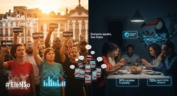 Além disso, 70% dos brasileiros relatam tensões familiares decorrentes de debates políticos online (DataSenado, 2024). A ausência de empatia e a construção de identidades idealizadas nas redes intensificam conflitos, transformando diferenças políticas em rejeições pessoais.