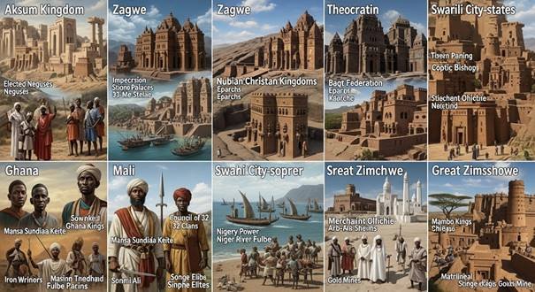 A estrutura variava: Aksum (séc. V–X) era monárquico-centralizado, com reis eleitos, expandindo-se para a Arábia via conquistas. Na Núbia cristã (Makuria, Nobatia, Alódia, séc. VI–XV), reis governavam reinos teocráticos resistentes ao Islã, com tributos ao califado. No Oeste, Gana (séc. IV–XIII) utilizava reis soninquês para controlar rotas, evoluindo para Mali (séc. XIII–XVI) sob mansas como Sundiata Keita, com assembleias de nobres. Songai (séc. XV–XVI) centralizou o poder militar sob Sonni Ali. No Leste/Sul, os estados swahilis eram cidades mercantis oligárquicas, e Grande Zimbábue (séc. XI–XV) era um chiefdom hierárquico, com elites controlando minas de ouro.