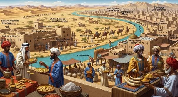 O comércio transaariano (ouro por sal) enriqueceu o Sahel, com Gana como “terra do ouro”; Mali exportava para o Cairo via camelos berberes. Aksum trocava marfim e incenso com Roma e Índia. Os swahilis negociavam porcelana chinesa por escravos e ouro, enquanto Zimbábue controlava rotas indianas. A agricultura (milhete, sorgo) e a pecuária sustentavam populações, com inovações como o ferro núbio.