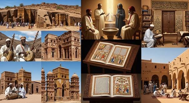 As culturas mesclavam oralidade, arte e saber: griots malianos preservavam épicos como Sundiata; a arquitetura aksumita influenciou Lalibela (séc. XII); os núbios pintavam igrejas com frescos coptas; os swahilis fundiam árabe com bantu em kiswahili e mesquitas de coral. Zimbábue ergueu torres de 11 m sem argamassa, simbolizando ancestralidade.