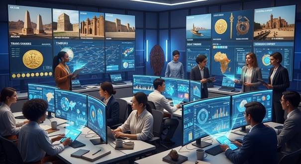 Essas civilizações sustentaram, por meio de suas rotas comerciais, uma economia interligada ao mundo mediterrâneo, ao Oriente Médio e ao Oceano Índico — contribuindo para a formação de uma economia-mundo pré-moderna. Mais do que centros de riqueza, foram polos de saber, onde o conhecimento circulava oralmente, nas escolas corânicas, nos manuscritos de Timbuktu ou nos ensinamentos transmitidos por griots, revelando uma epistemologia plural que unia espiritualidade, técnica e comunidade.